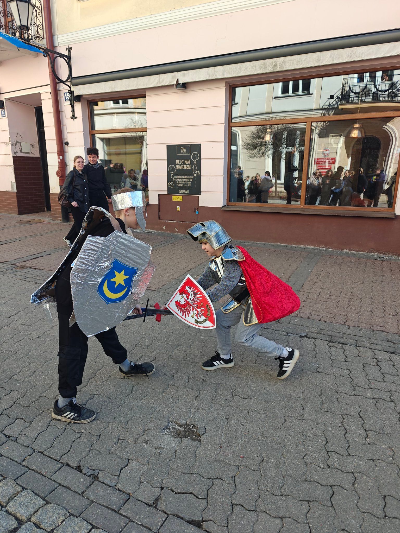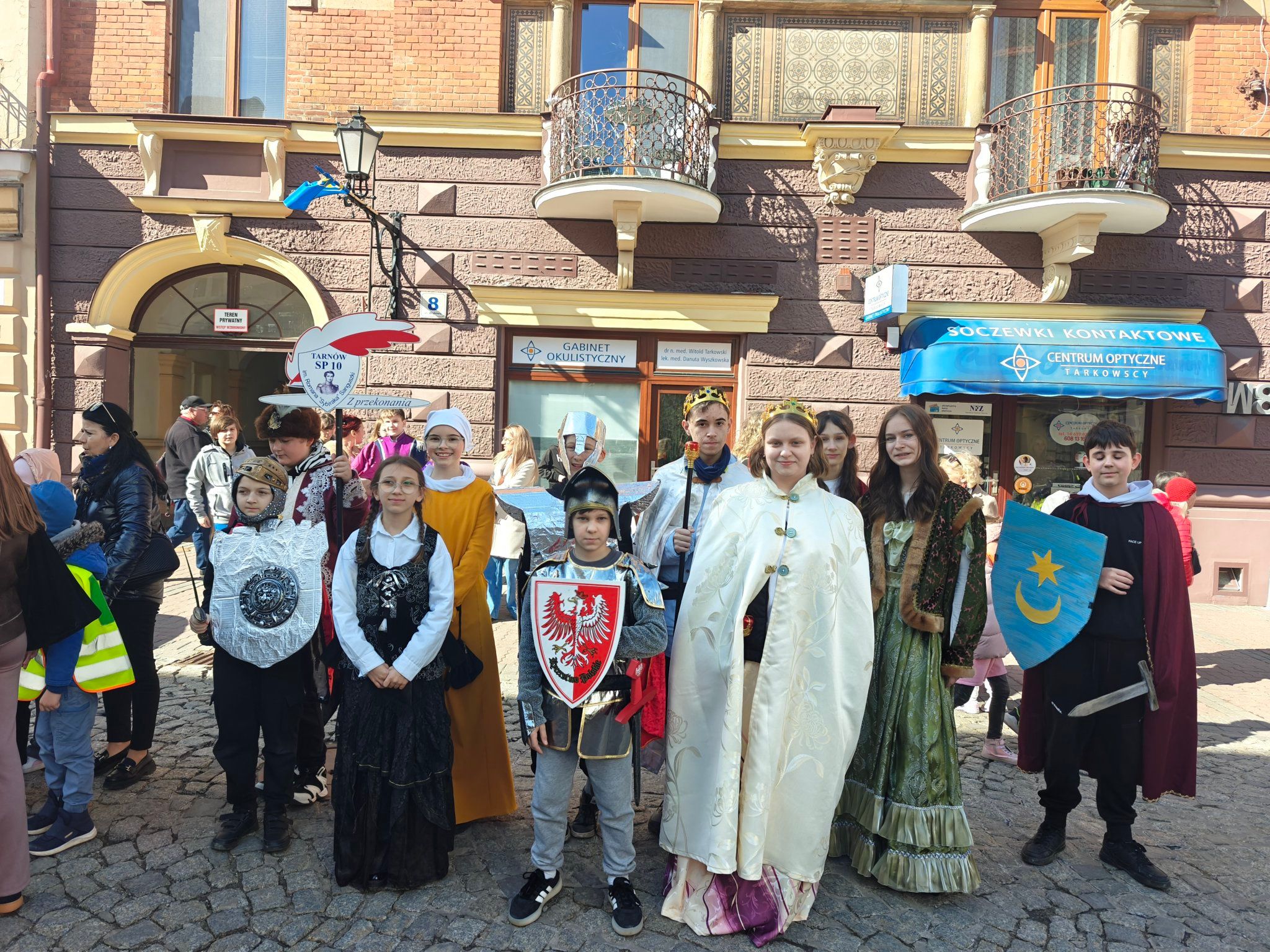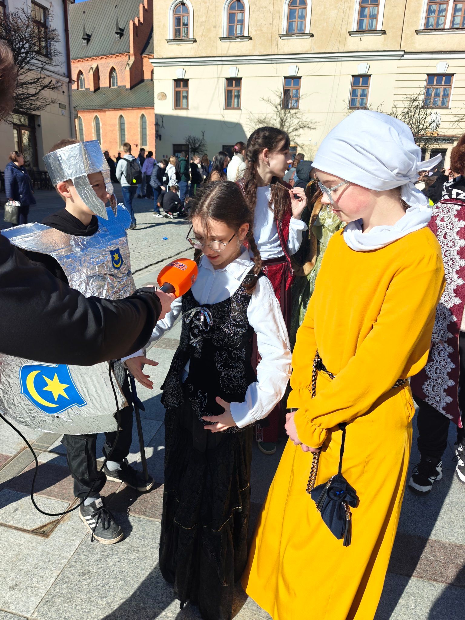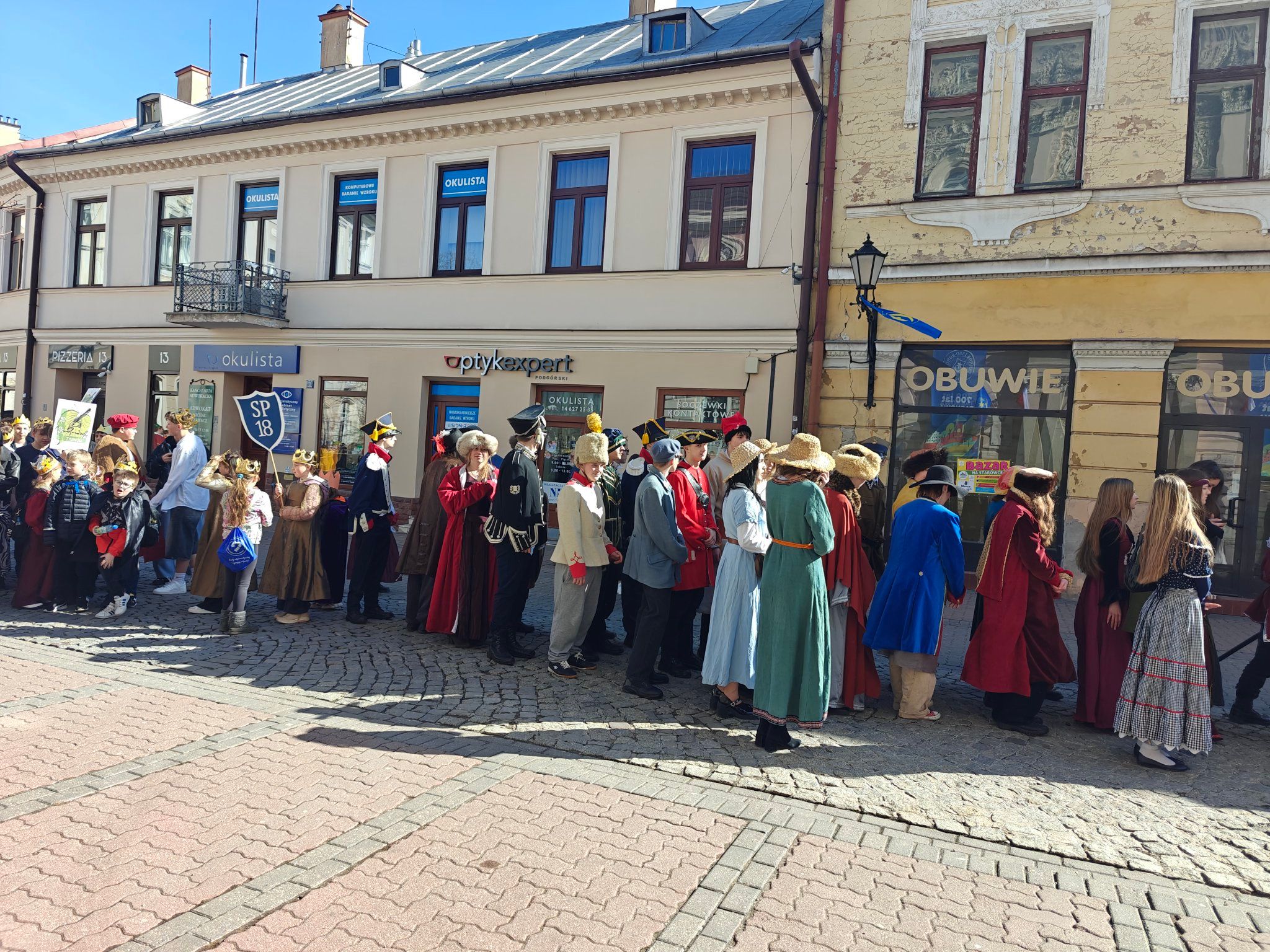 W barwnym korowodzie przemaszerowaliśmy ulicą Wałową na Rynek, gdzie odbyły się główne uroczystości. Mogliśmy wczuć się w klimat dawnej epoki. Wydarzenie to stało się okazją do zaprezentowania wspaniałych strojów przygotowanych przez naszych uczniów.